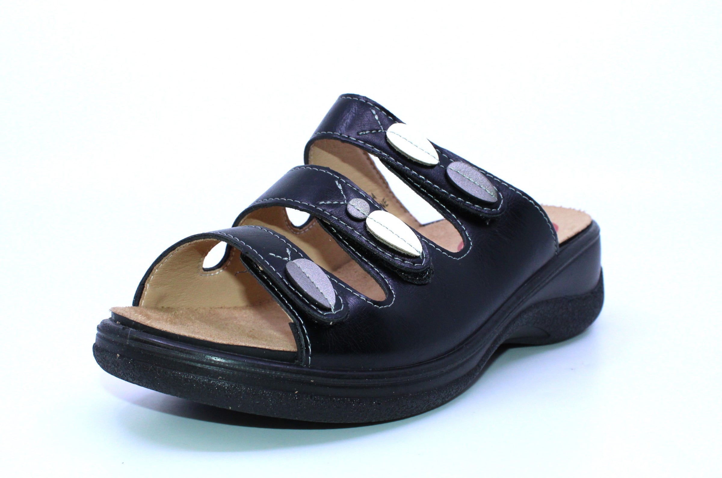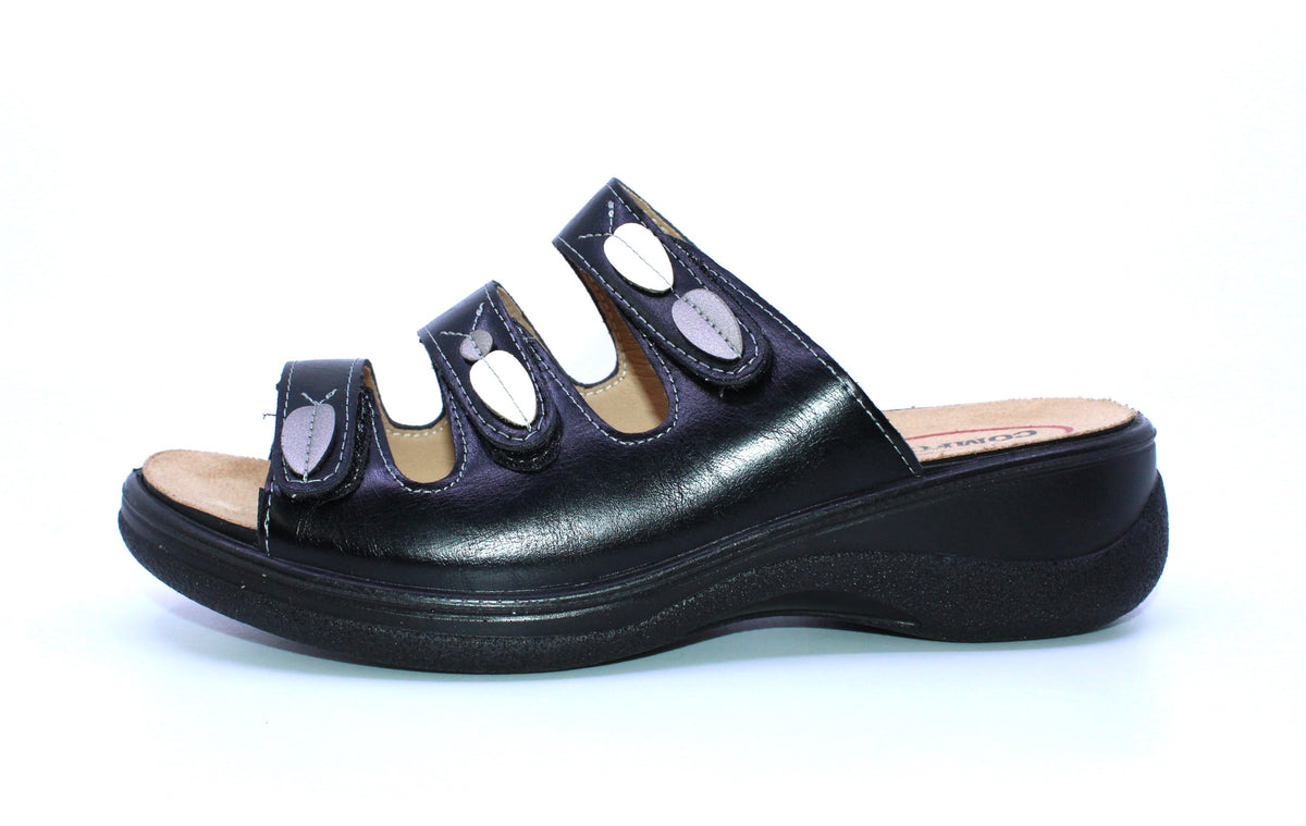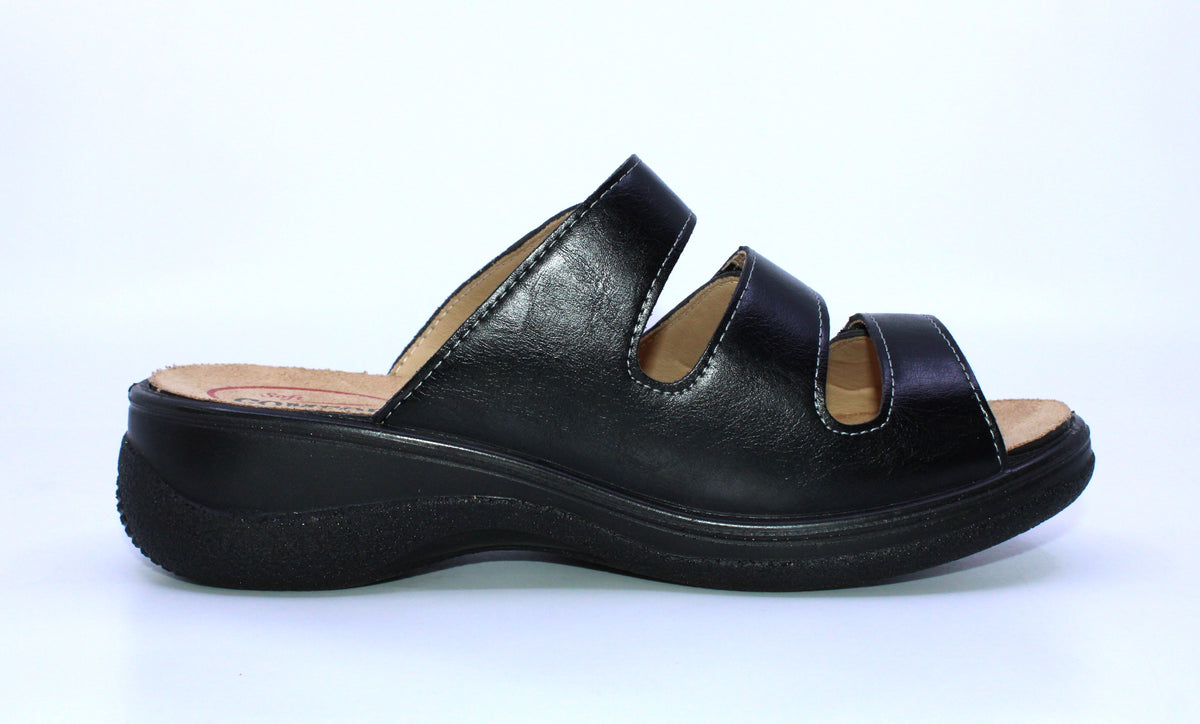 La sandale Soft Comfort est fait de cuir synthétique. Ses velcros permettent de bien l’ajuster pour ensuite l’enfiler facilement et rapidement en y glissant simplement le pied. Sa semelle intérieure amovible permet d’y insérer votre orthèse au besoin et sa semelle extérieure est antidérapante.